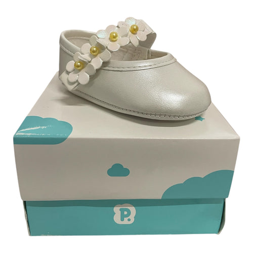 Baby Girl White Flower Shoes – Soft Sole with Pearl Details (Pimpolho)