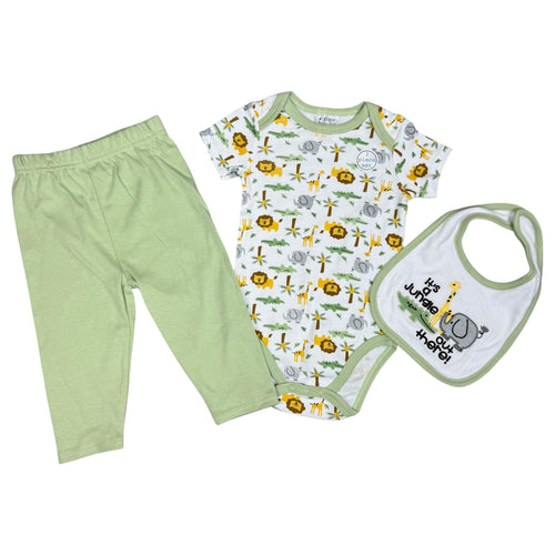 Baby Boys 3-Piece Outfit Set – Jungle Animals – Bodysuit, Pants & Bib