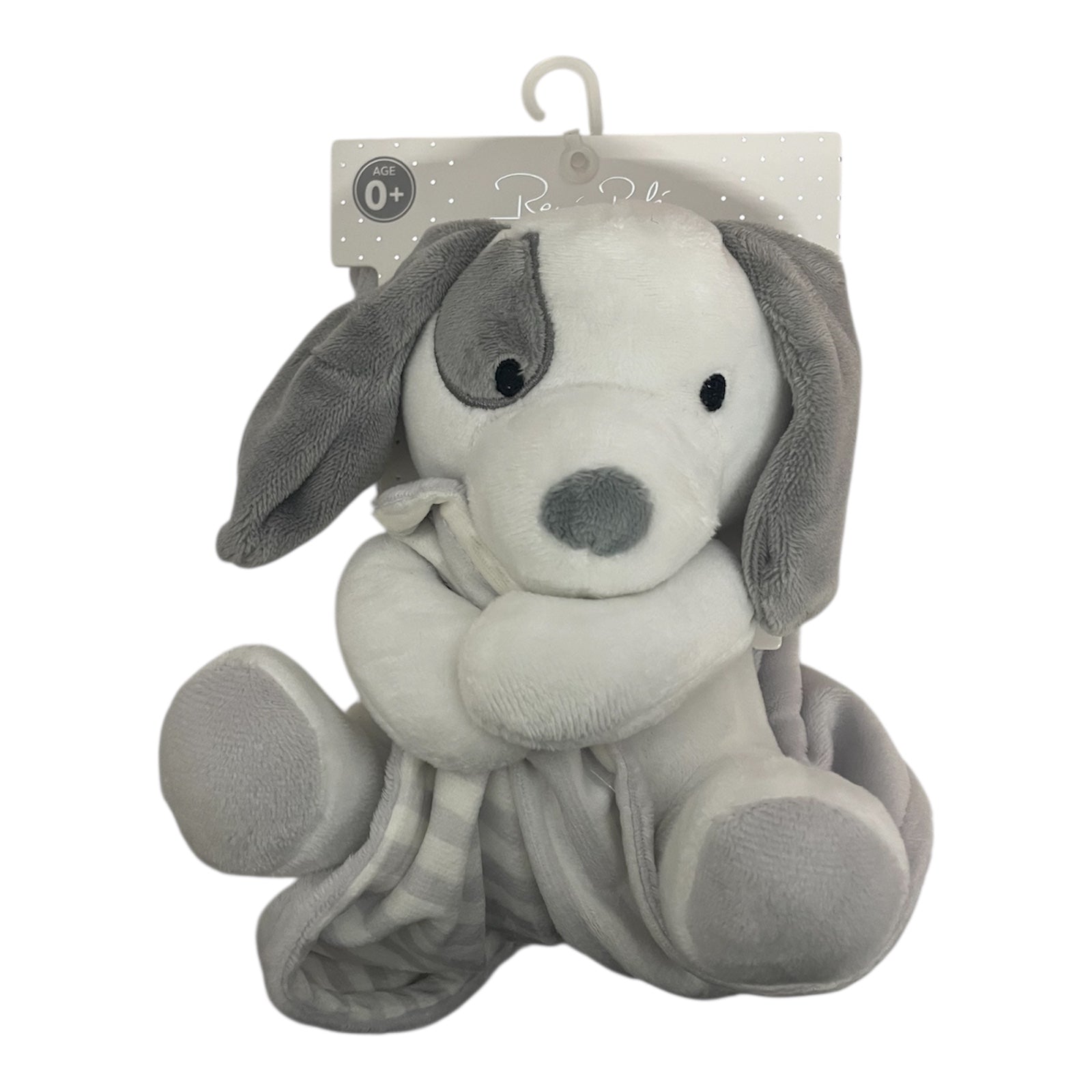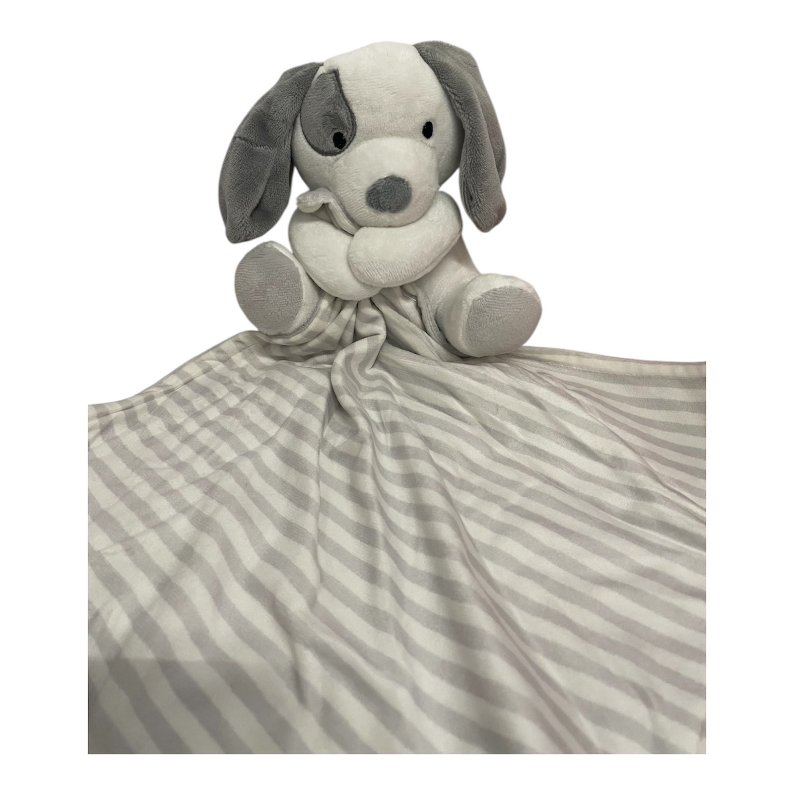 Color: Gray and white striped blanket with gray puppy plush