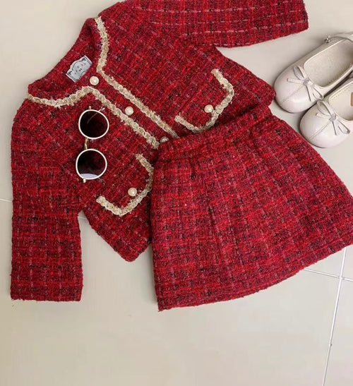 Luxury Girls 2-Piece Tweed Outfit – Jacket & Skirt Set – Red/Black – Fall & Winter Fashion