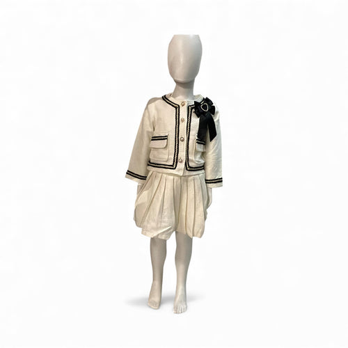 Girls White Tweed Jacket & Skirt Set 2–10Y – Elegant Outfit w/ Bow, Pearl Buttons, Fall Winter Fashion