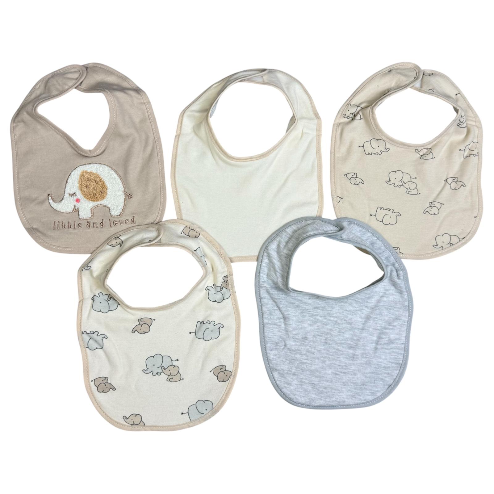 🍼 5-Pack Baby Bibs – Soft Cotton Elephant Design – Neutral Colors (Unisex)