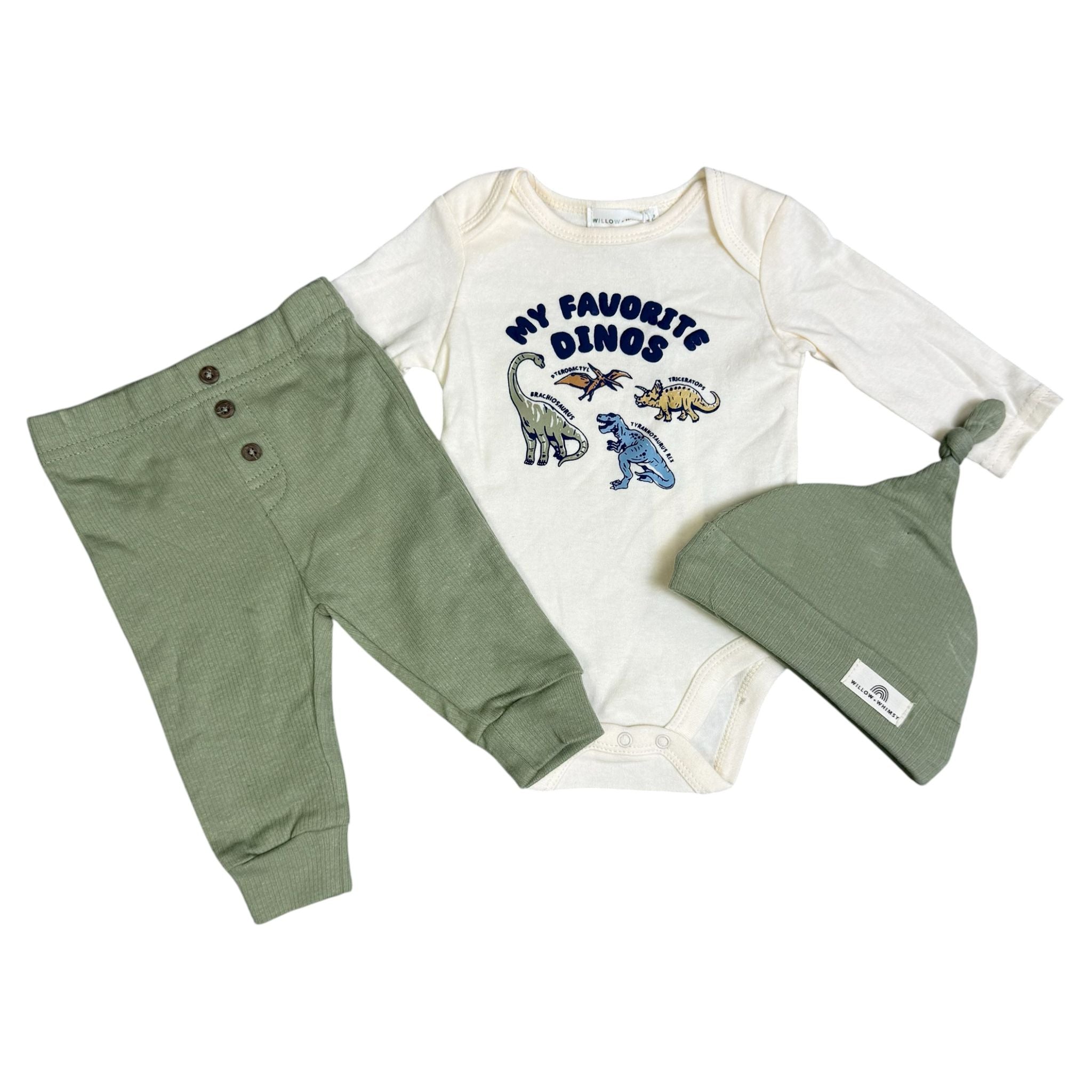 Baby Boy 3-Piece Outfit – “My Favorite Dinos” Bodysuit, Pants & Hat Set