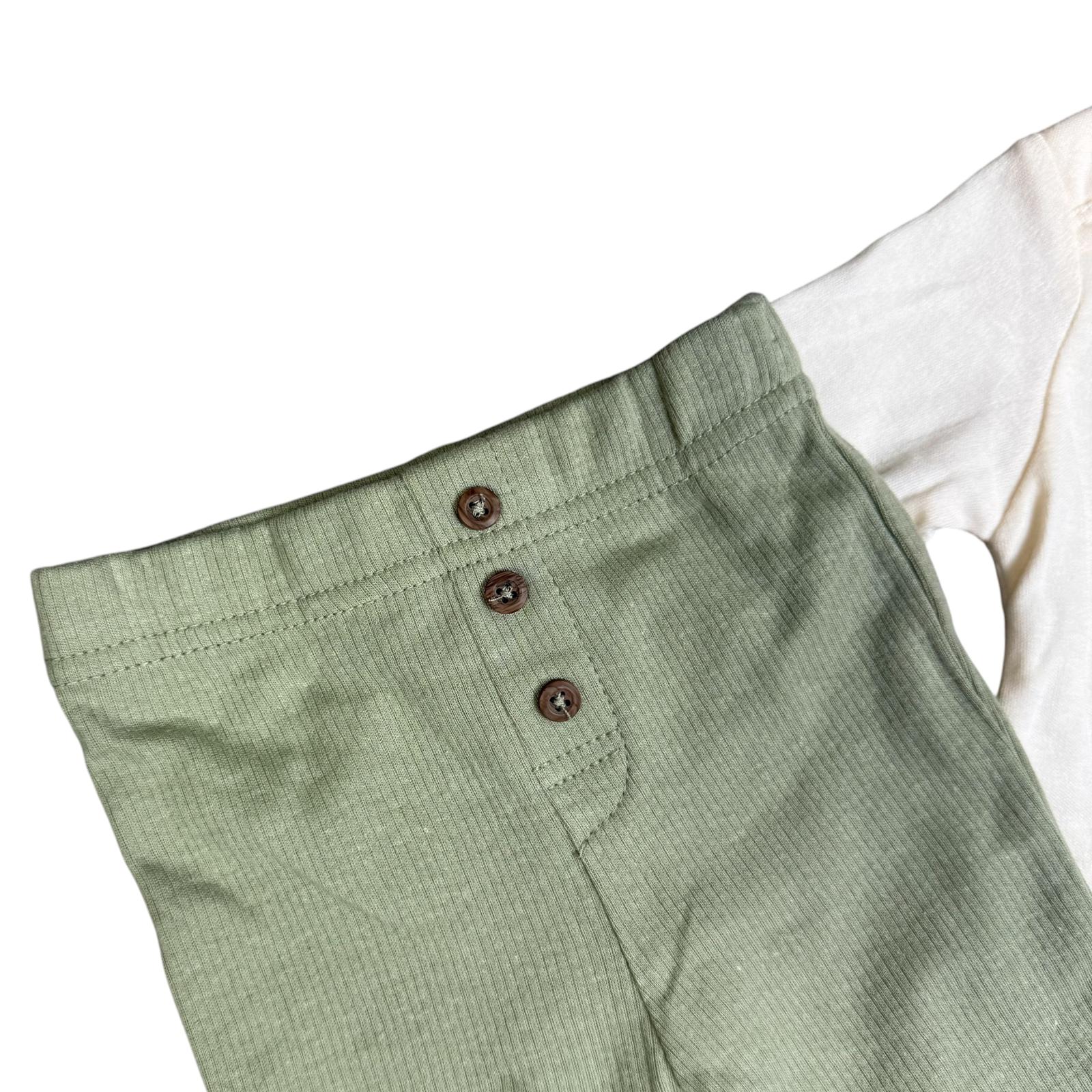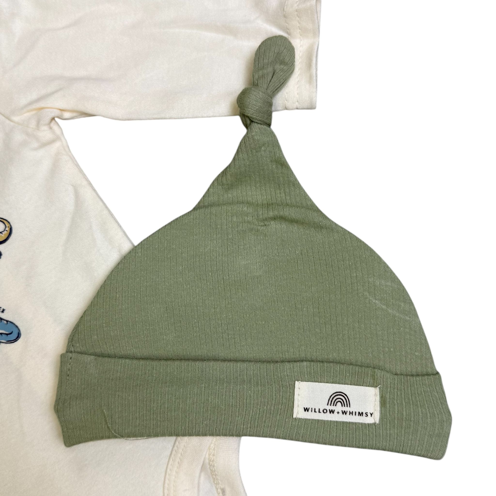Your little dino lover will look adorable and comfy in this 3-piece outfit set! Featuring a long sleeve bodysuit with cute dinosaur prints, soft ribbed pants, and a matching hat with a knot top – this set is perfect for every adventure! 🌿🦖