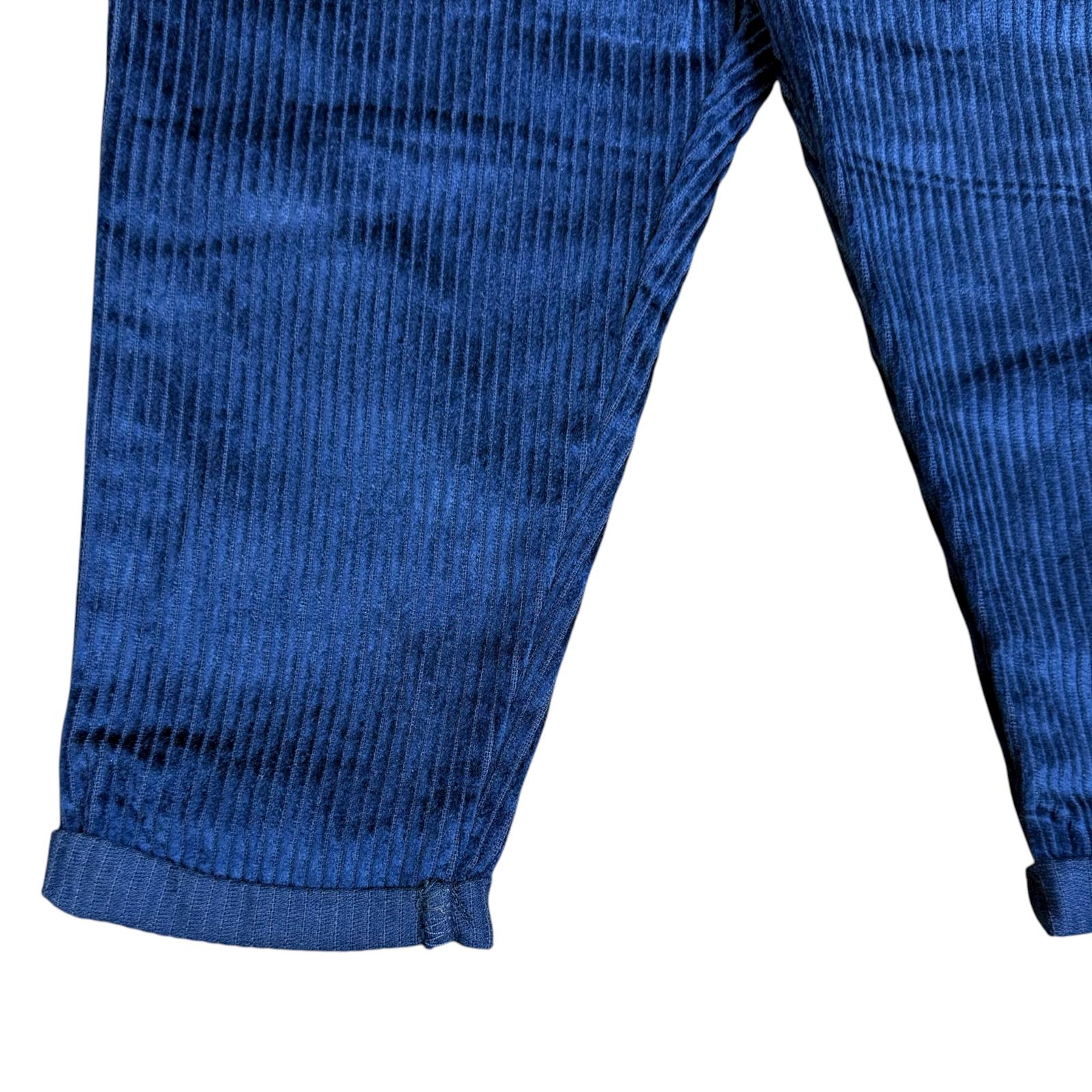 - Pants: Navy blue corduroy-style pull-on pants with elastic waistband and decorative drawstring. Comfortable fit for all-day wear.