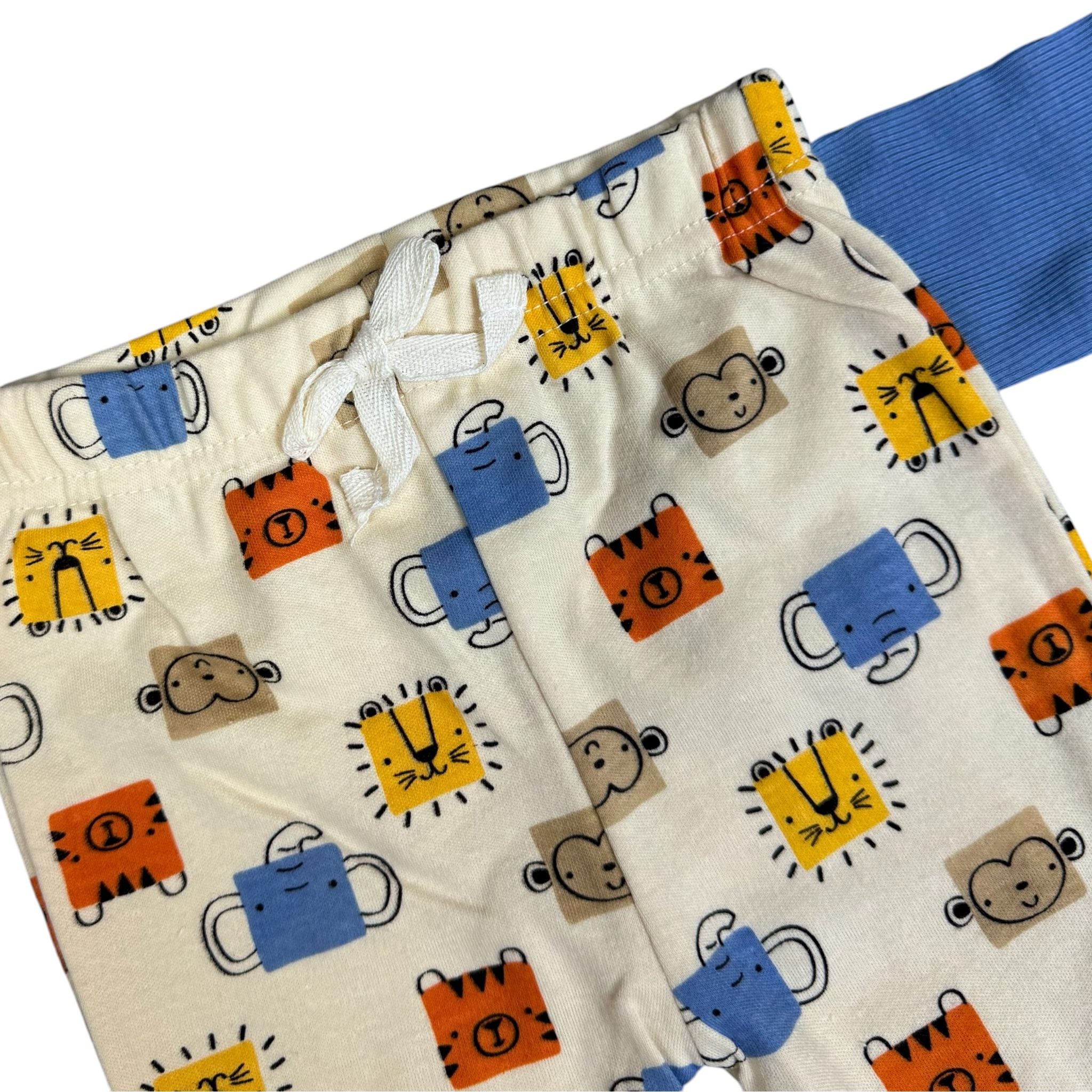 - Pants: Cream background jogger pants with all-over animal faces (lion, monkey, elephant, tiger) in colorful blocks. Soft waistband with decorative drawstring.
