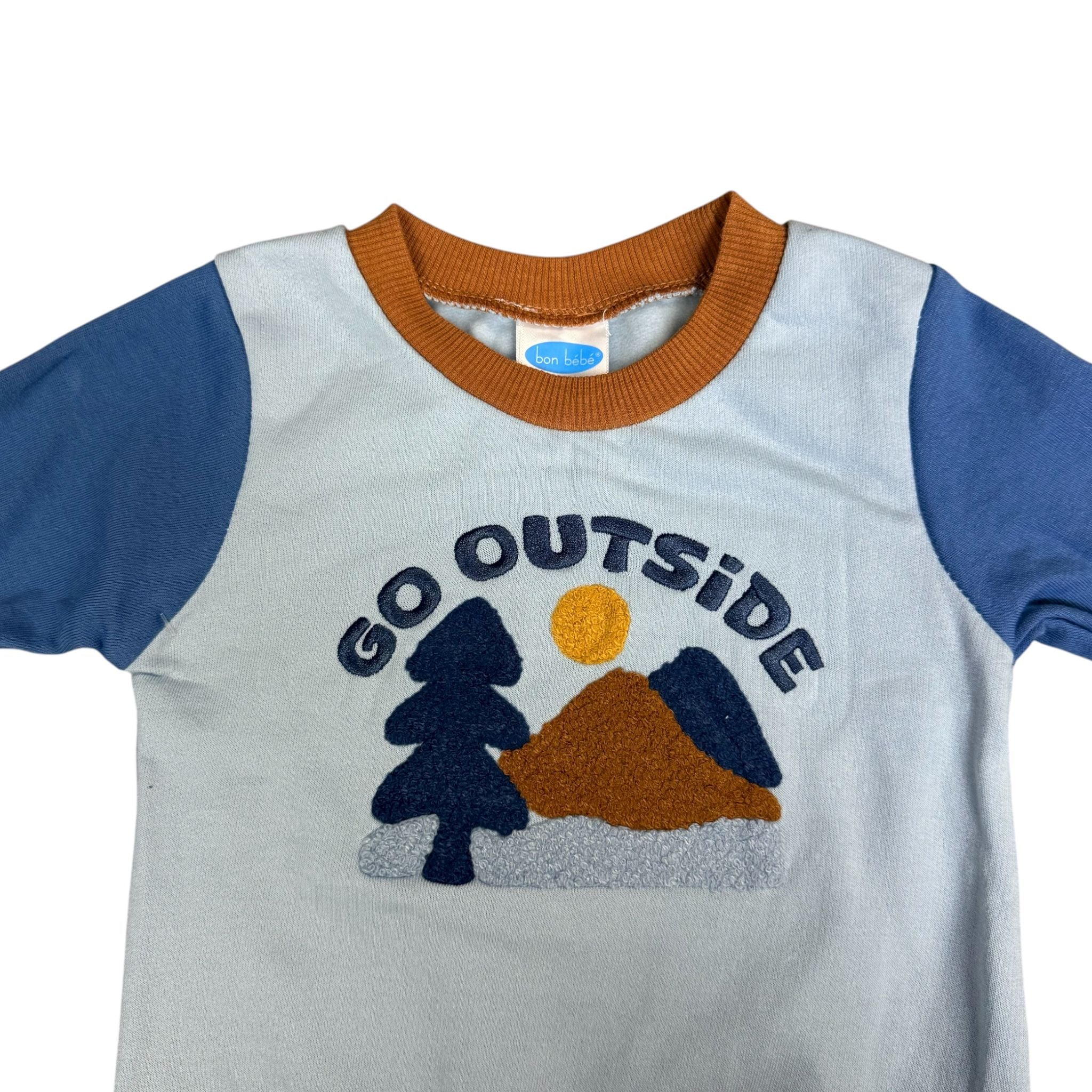 - Sweatshirt: Light blue body with navy blue sleeves, brown ribbed trim, and a textured applique design with trees, mountains, and sun. Embroidered phrase “GO OUTSIDE”.