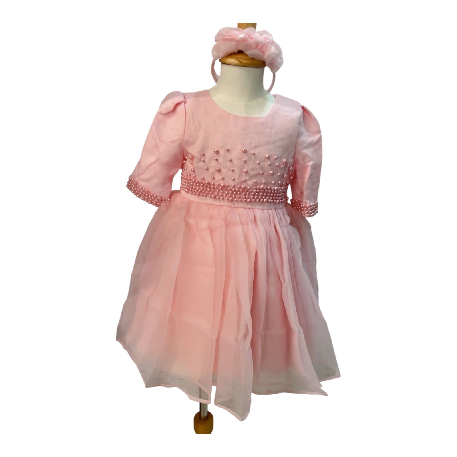Featuring beautiful pearl embellishments on the bodice and sleeves, plus a layered tulle skirt with volume for that adorable princess look.