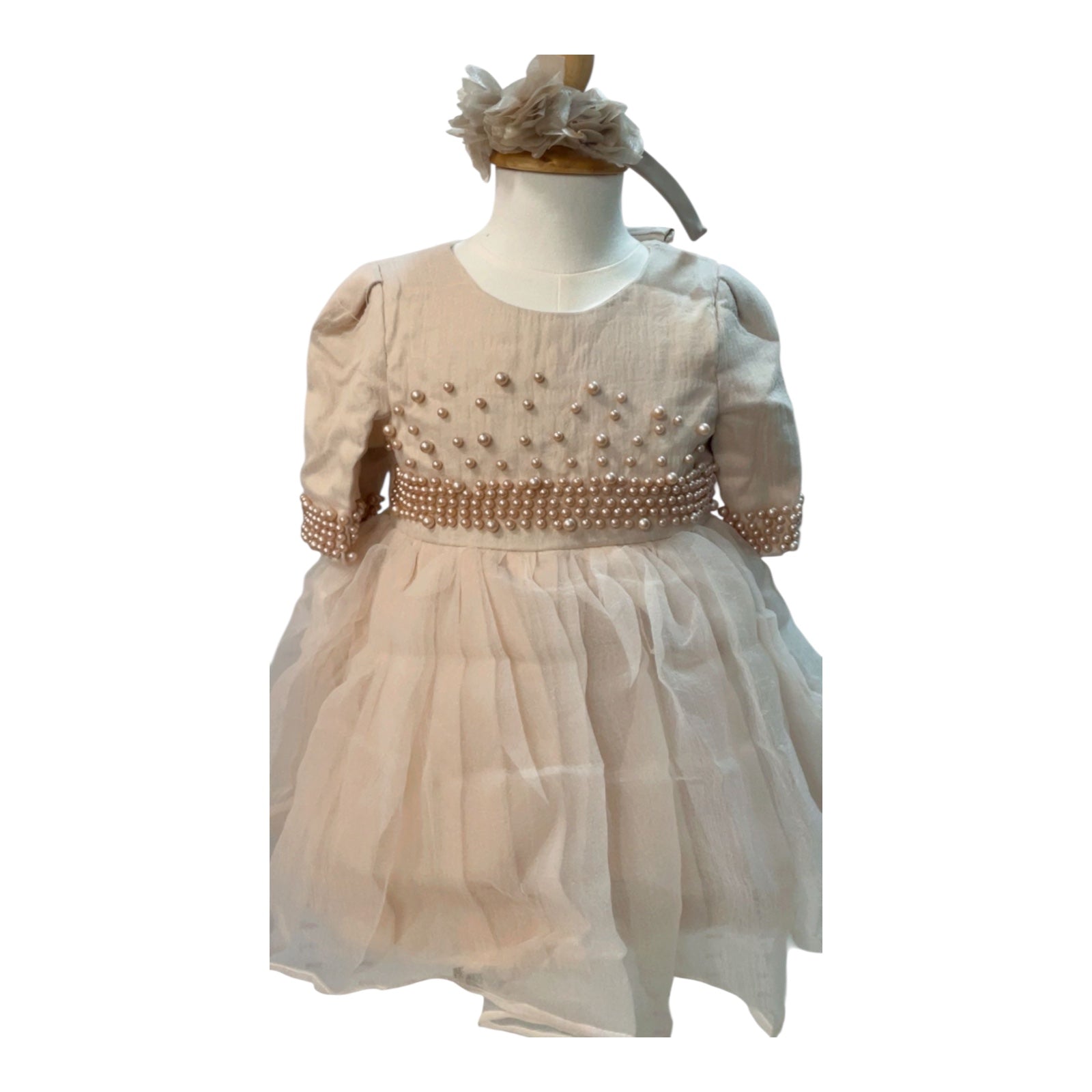 Designed with beautiful pearl embellishments on the bodice and sleeves, plus a full layered tulle skirt, it creates a charming and graceful look for your little girl.