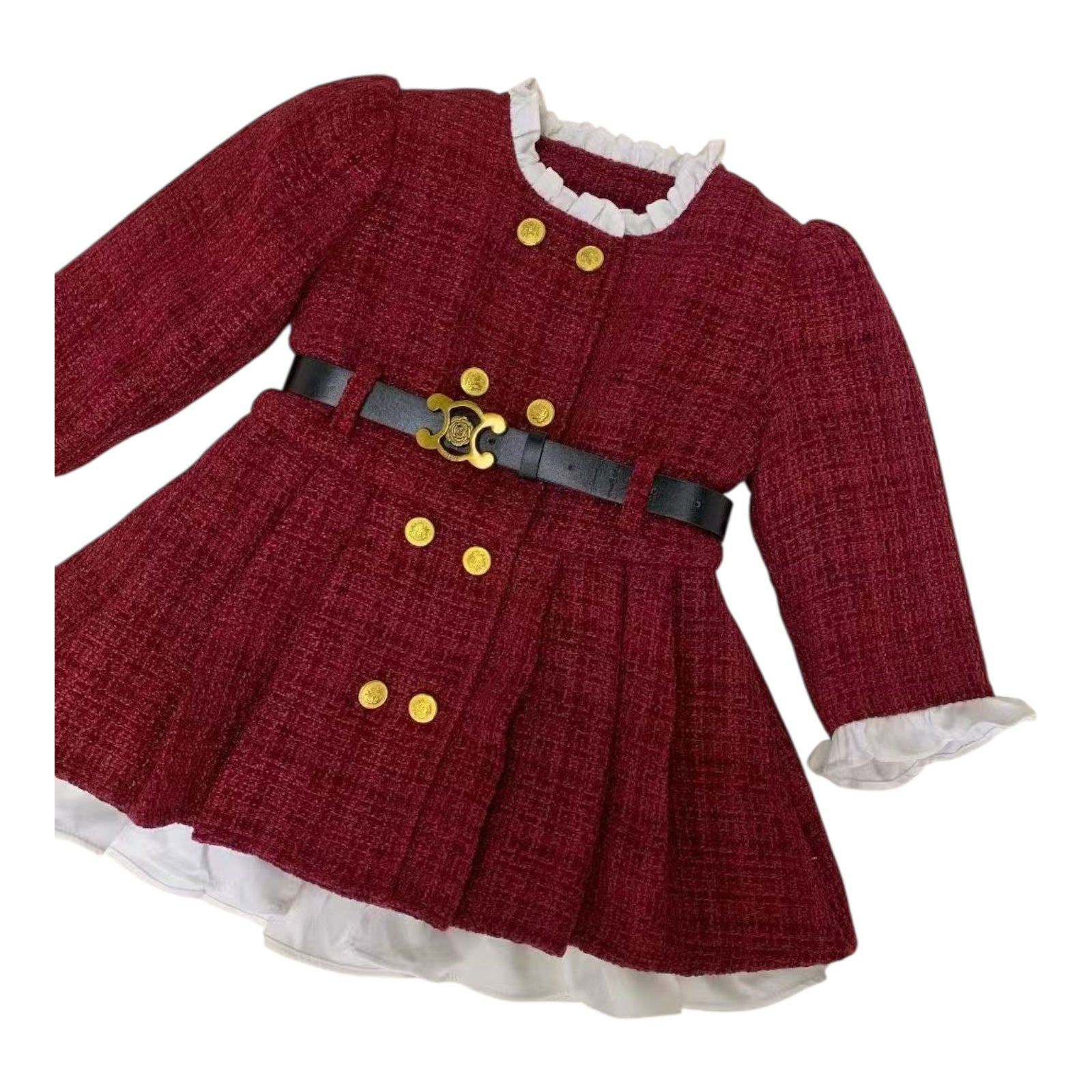 This luxurious burgundy tweed dress brings all the elegance and charm your little girl deserves for the holiday season. With gold double-breasted buttons, a stylish belt with designer-inspired buckle, and adorable ruffle trim, it’s the perfect outfit for Christmas Eve, Santa photos, school parties, winter birthdays, and family celebrations!