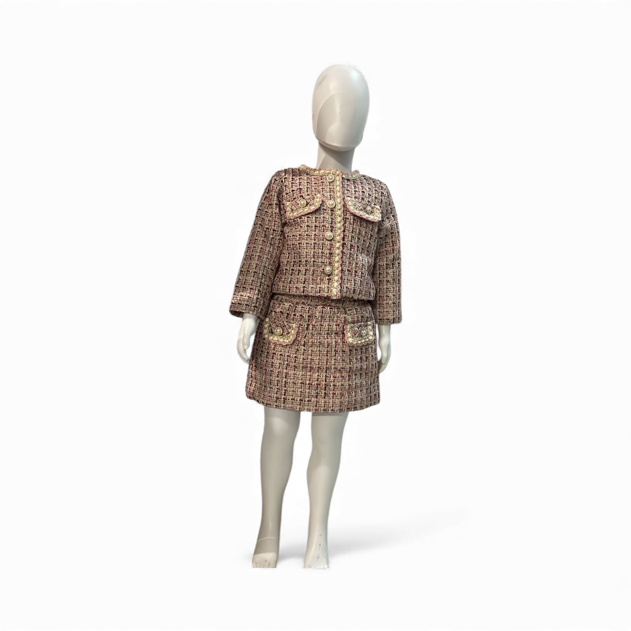 For little girls who love to dress with elegance! This gorgeous 2-piece tweed set delivers a premium boutique look with rich woven textures, pearl button accents, and glamorous pocket details. Perfect for stylish outings and special occasions. 💖