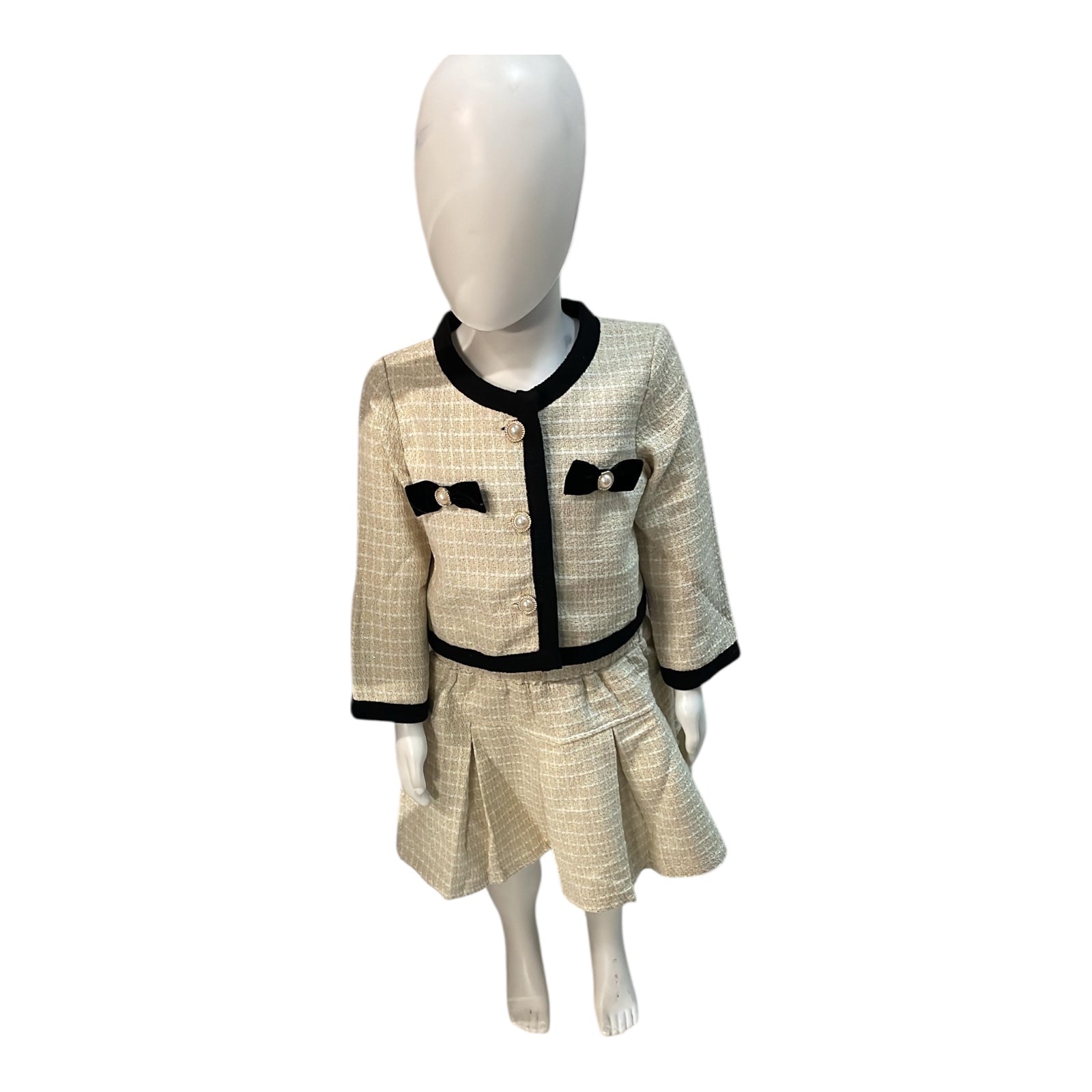 A stylish and elegant outfit inspired by modern luxury fashion! This beautiful set includes a pearl-button tweed jacket and a matching pleated skirt — perfect for little fashionistas. 💁♀️✨