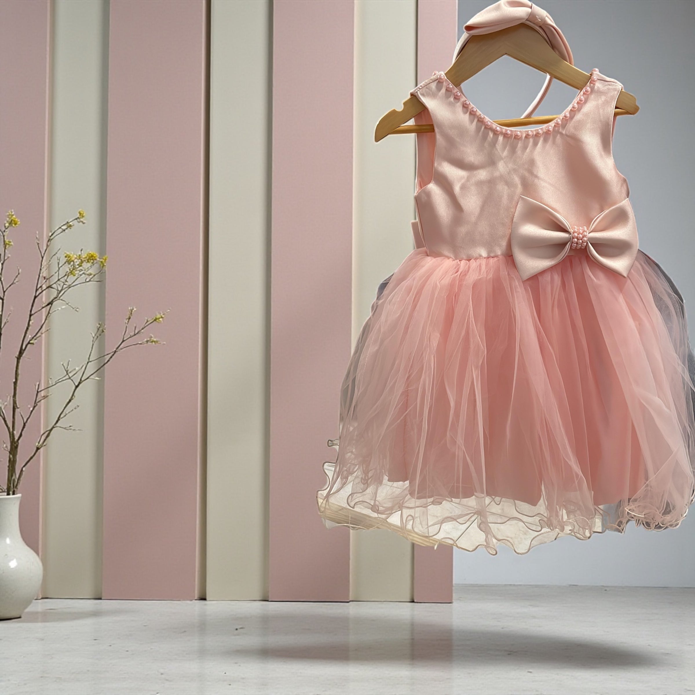 This stunning baby girl dress is the perfect outfit for any special celebration! It features a silky satin top with a beautiful pearl-accented bow and a fluffy layered tutu skirt that gives a magical princess look. Includes a matching headband to complete the outfit! 💖✨
